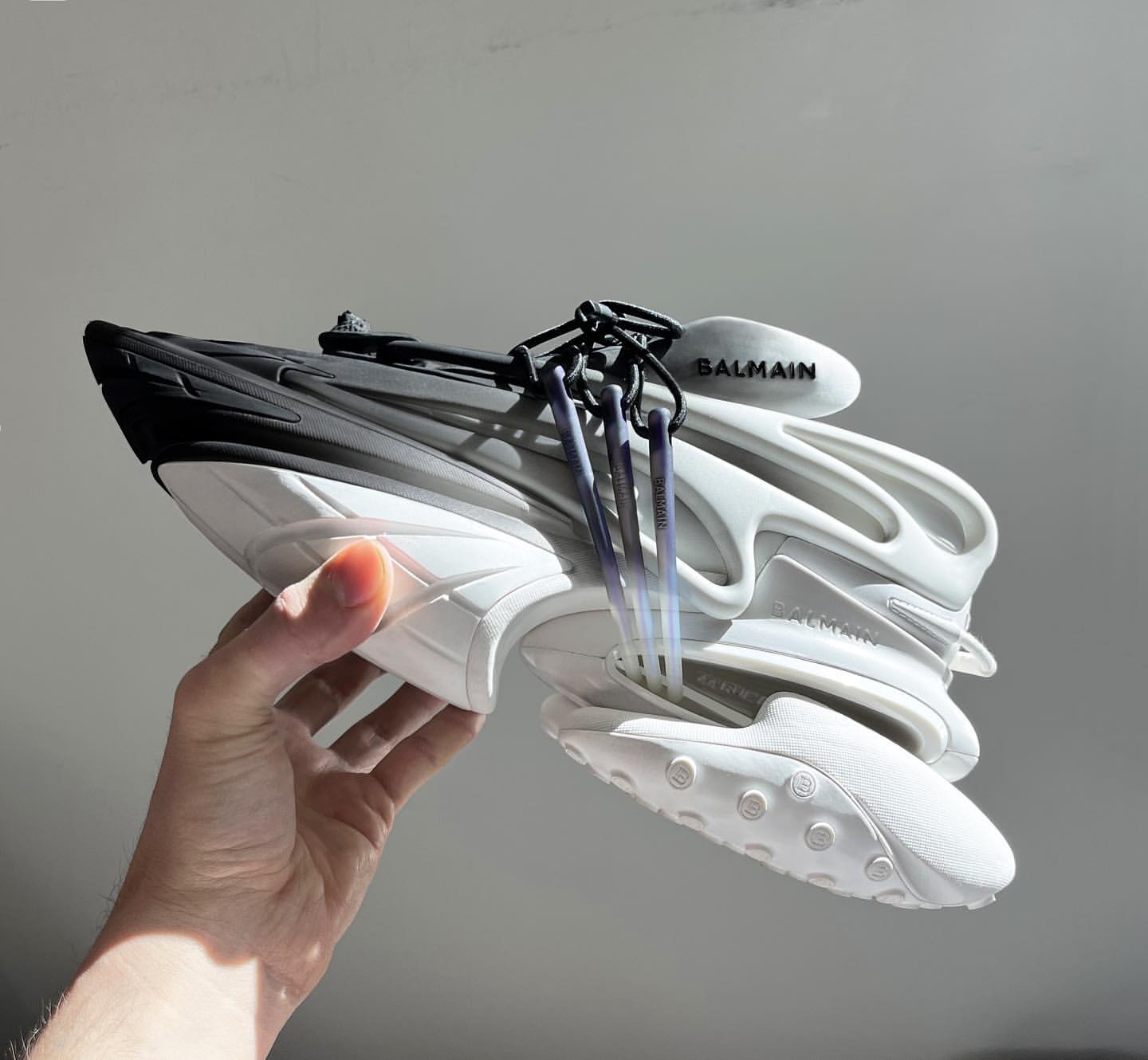 O design de Safa Sahin tem dividido opiniões, muito pela abordagem maximalista que parece saída de uma novela gráfica japonesa. A mistura de materiais em borracha e acabamentos glossy dão ao modelo uma estética futurista, além do toe arrebitado e do design com linhas torcidas que agarram qualquer atenção. As Unicorn assentam ainda sobre uma sola de suspensão oversized, e contam com um sistema duplo de atacadores e um lace lock com o branding da Balmain.