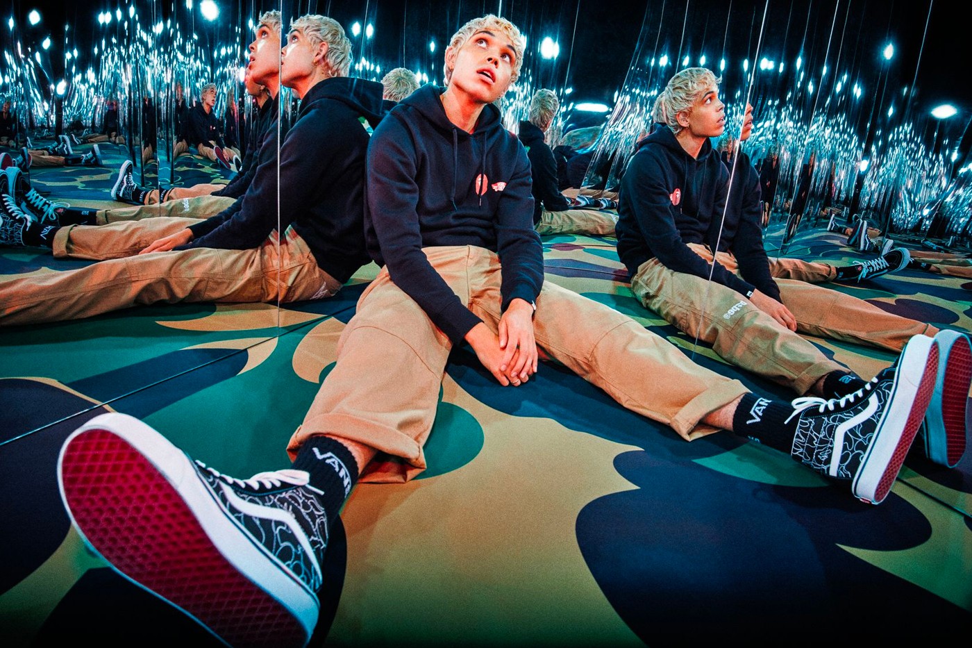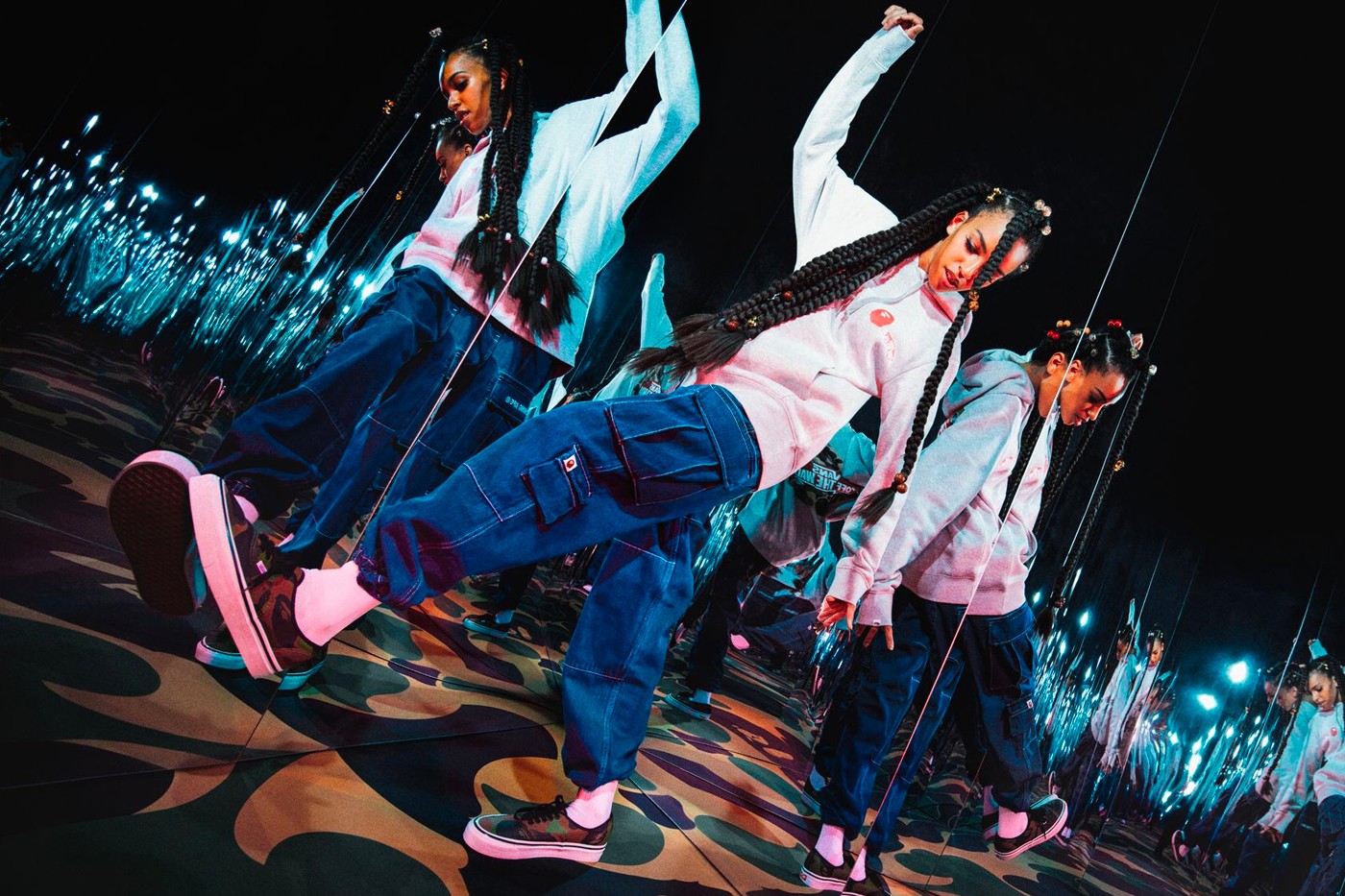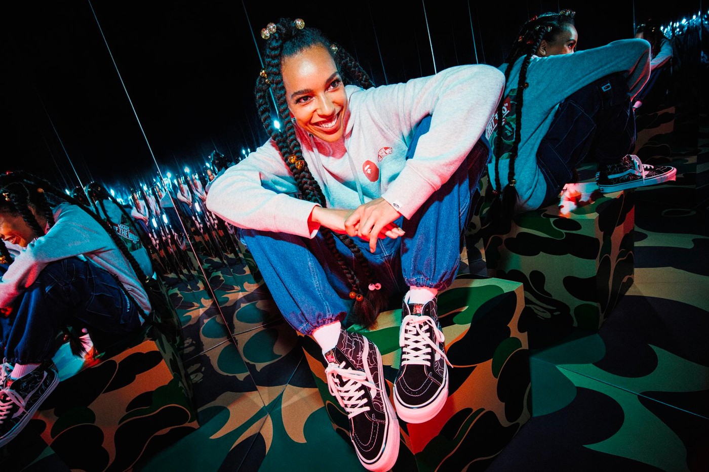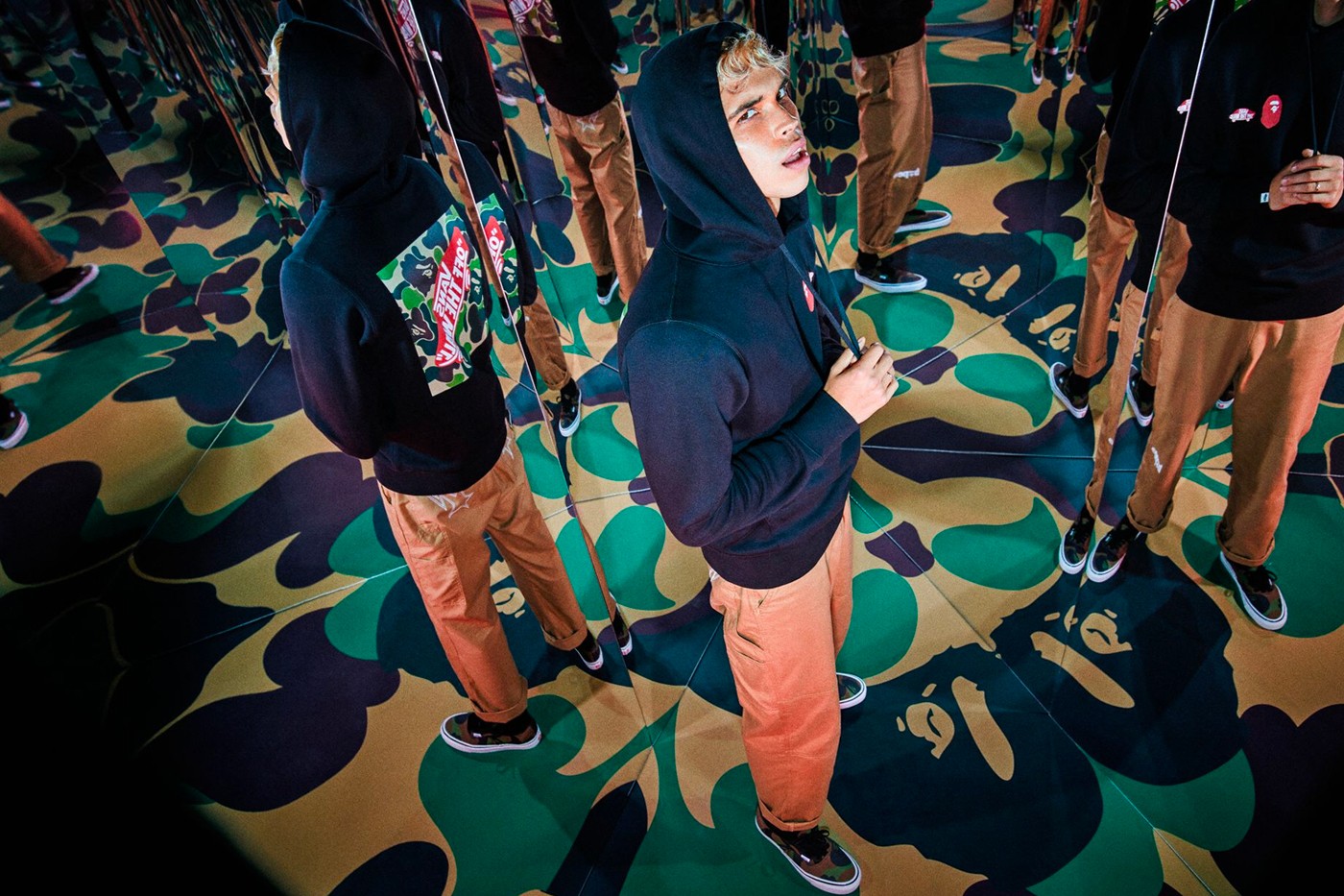 A cápsula inclui um hoodie em preto e outro em cinza, com o co-branding das duas marcas, que acompanham os verdadeiros highlights da parceria: umas Sk8-Hi 38 DX e umas Authentic 44 DX. As primeiras apostam numa base preta com o contorno do tradicional padrão ABC da BAPE a branco, enquanto que as segundas chegam numa combinação de ripstop da Vans com o padrão camo BAPE.